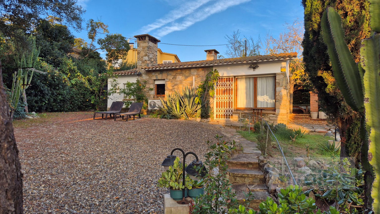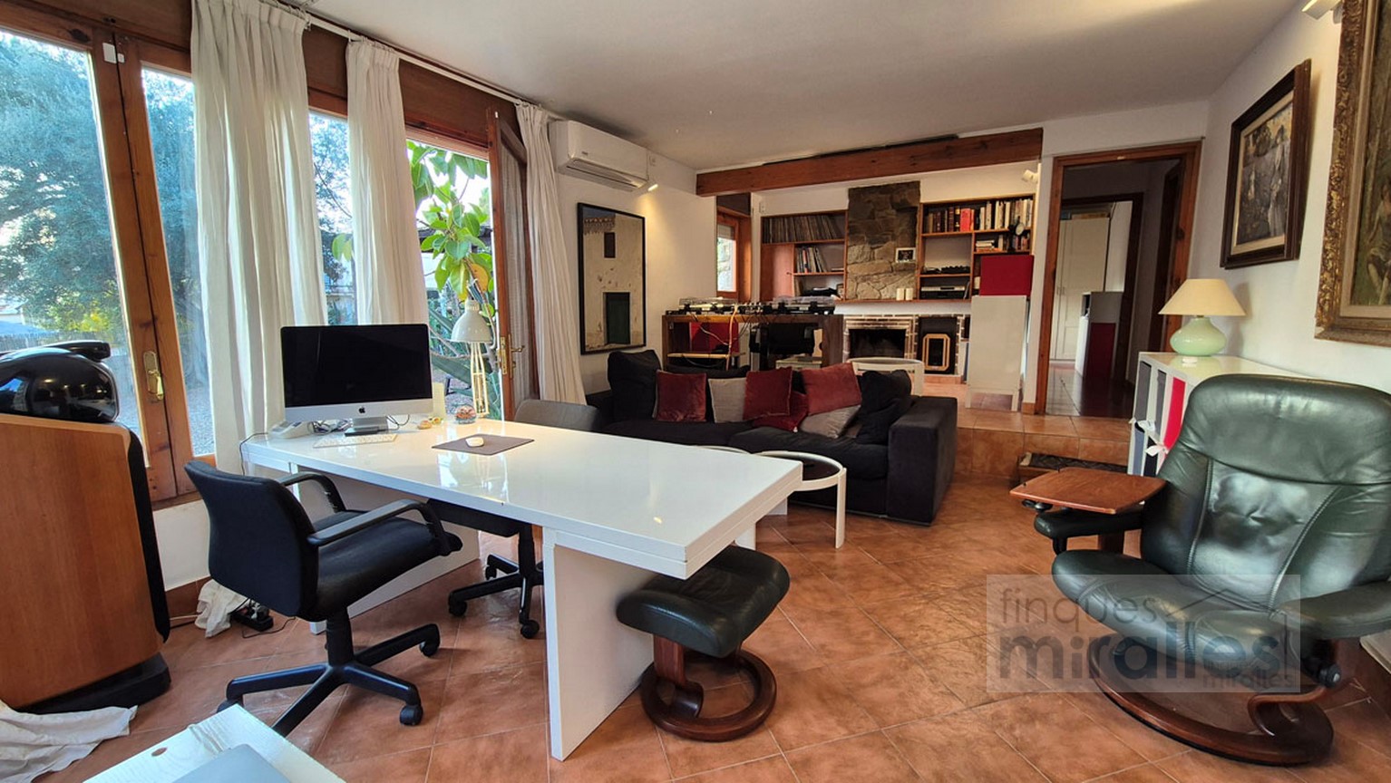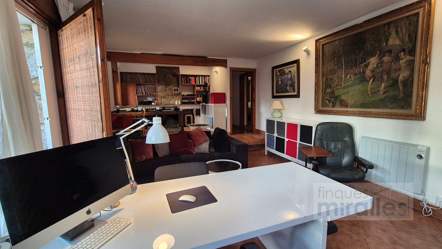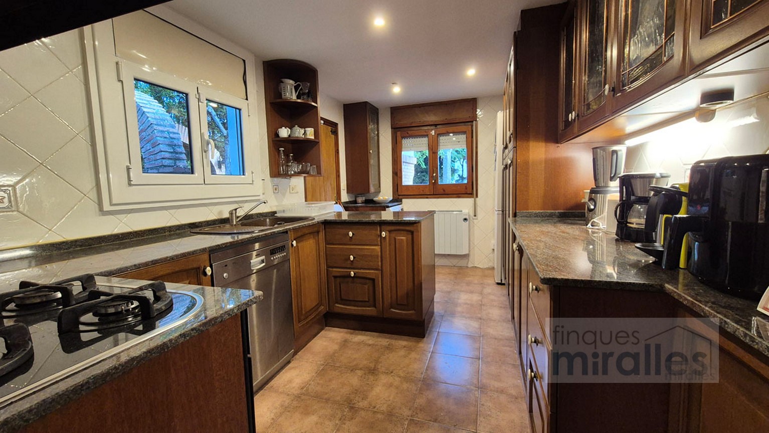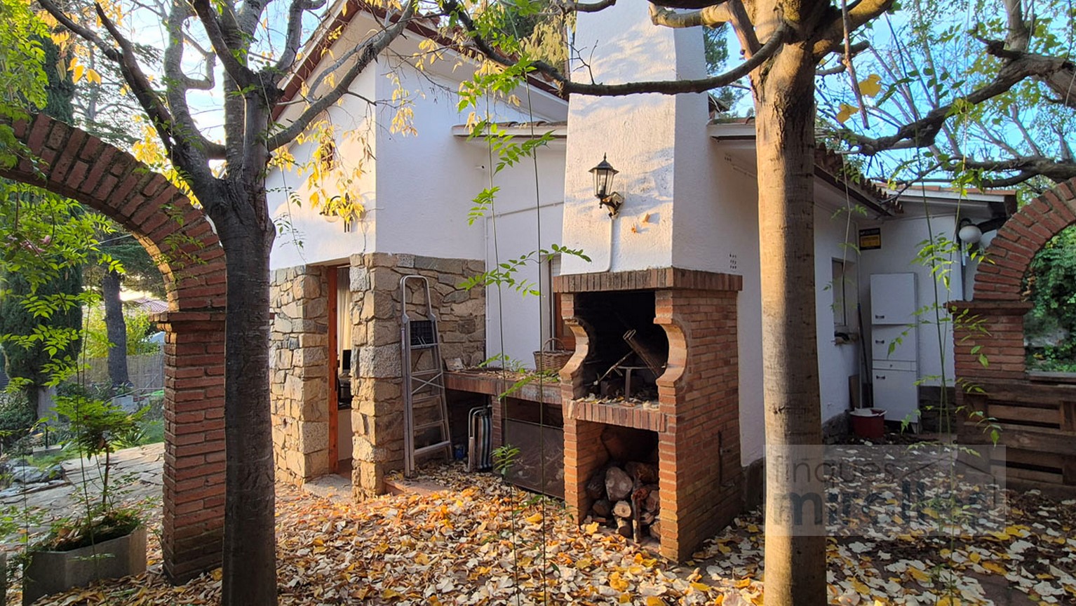 Menjador – sala d’estar amb llar de foc. (en dos nivells) Un dels nivells amb tarima de fusta, amplia cuina amb sortida al jardí.