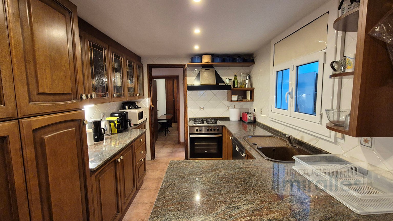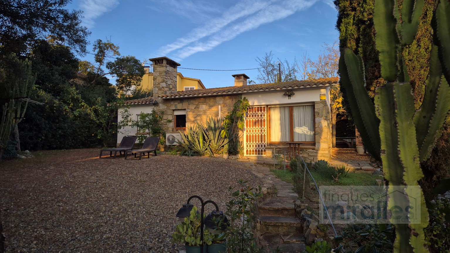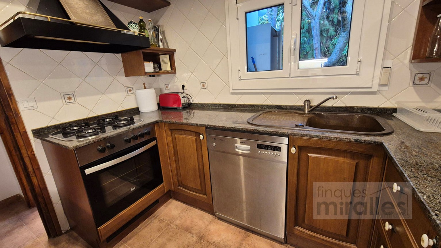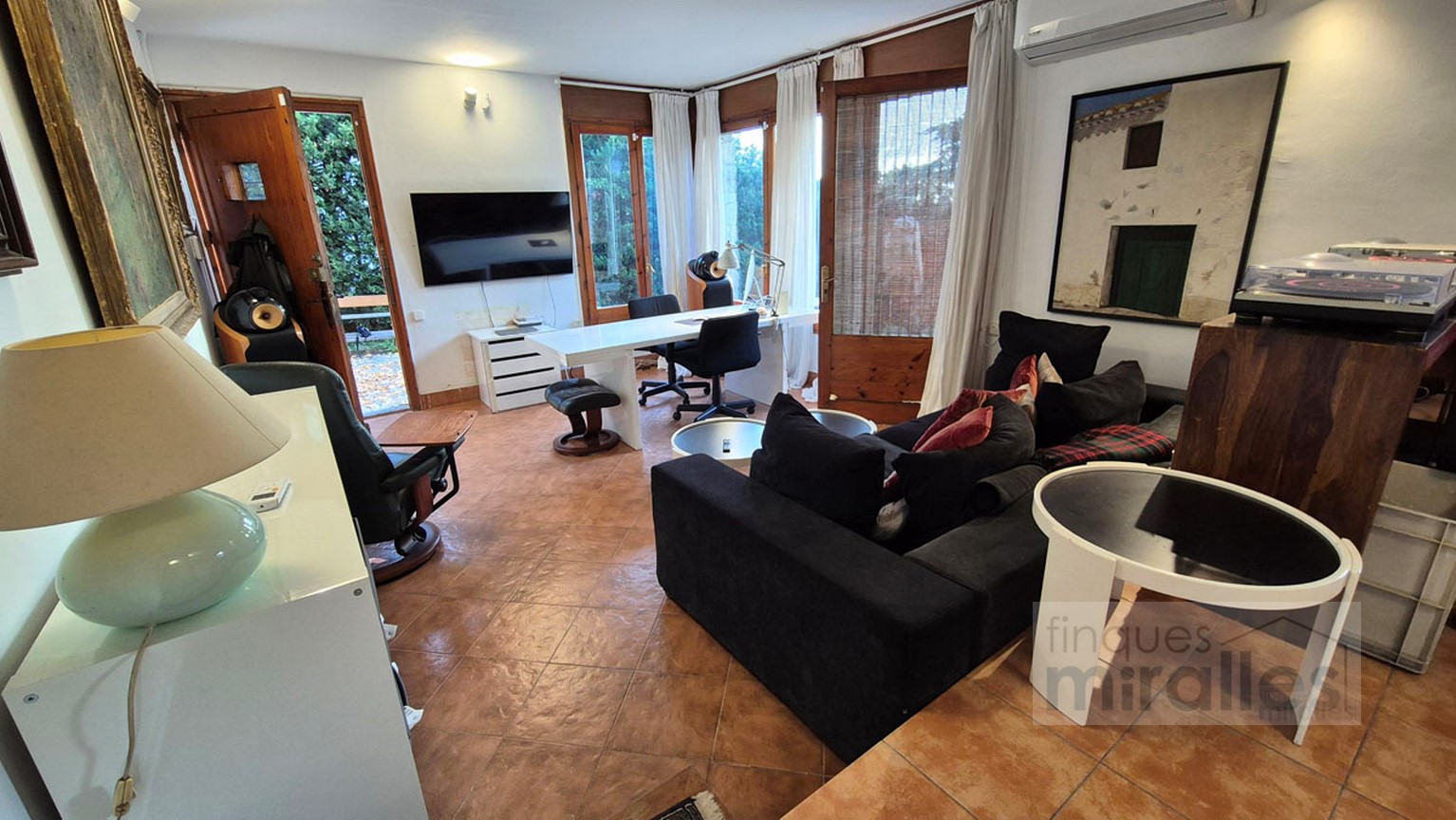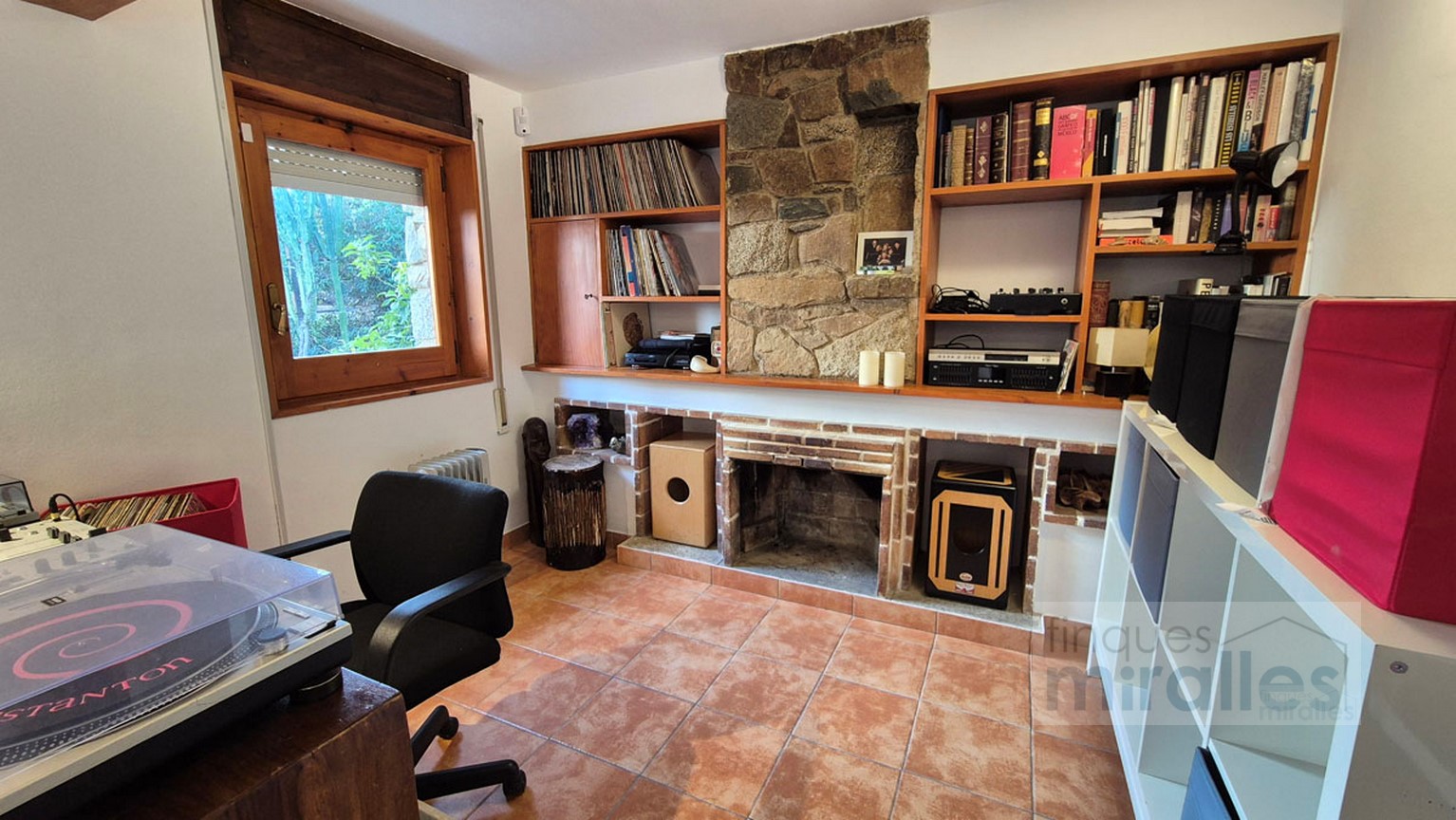Menjador – sala d’estar amb llar de foc. (en dos nivells) Un dels nivells amb tarima de fusta, amplia cuina amb sortida al jardí.