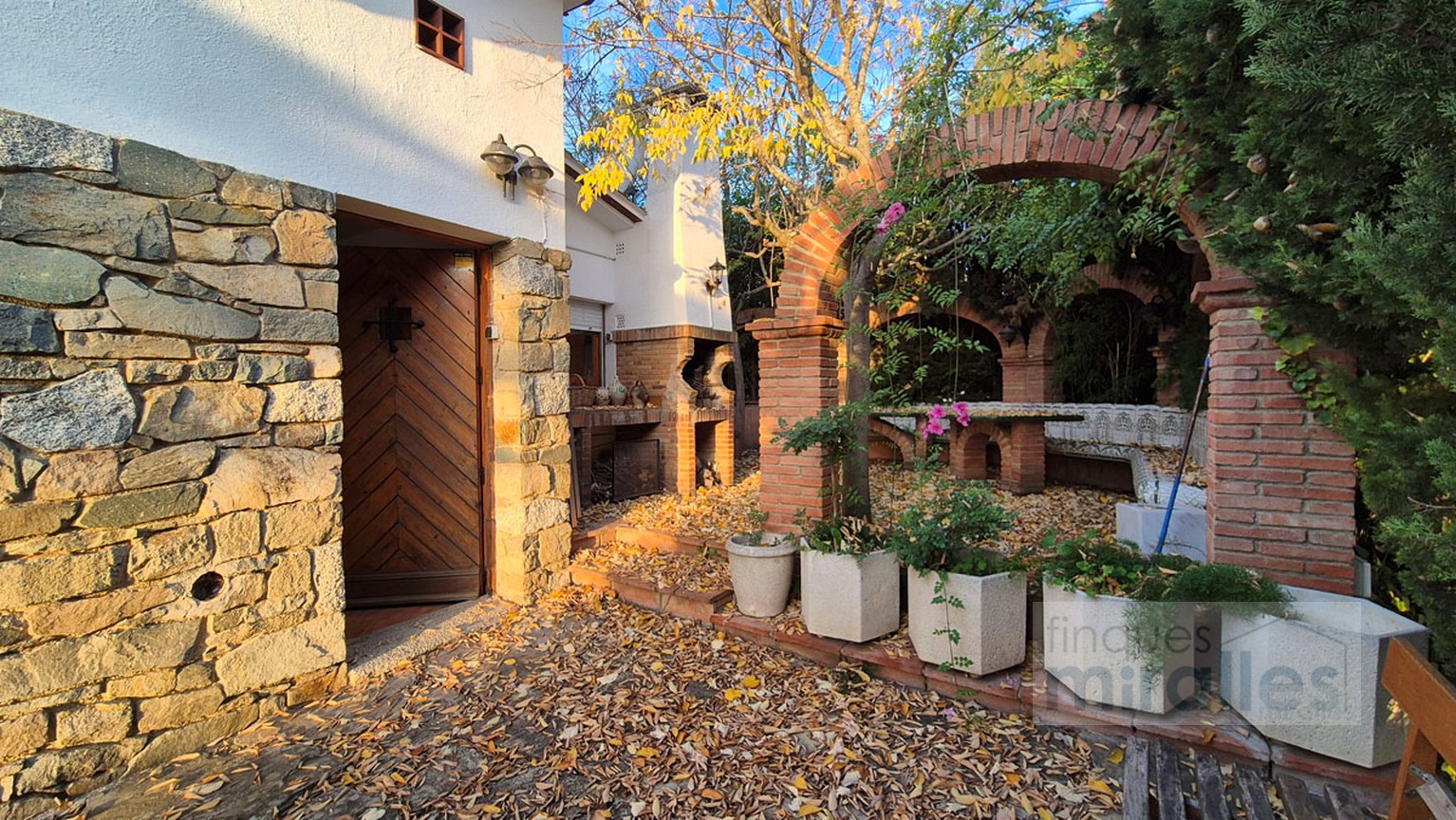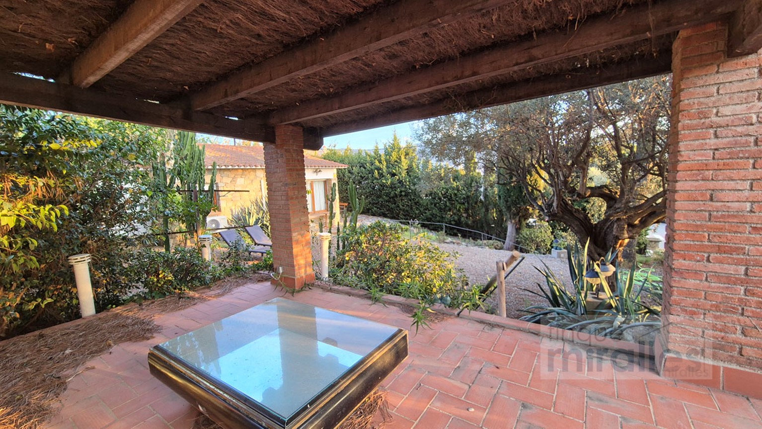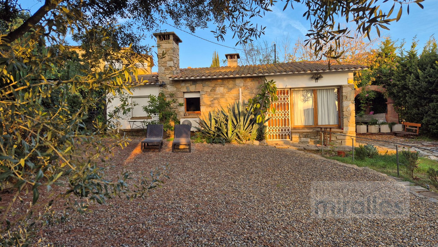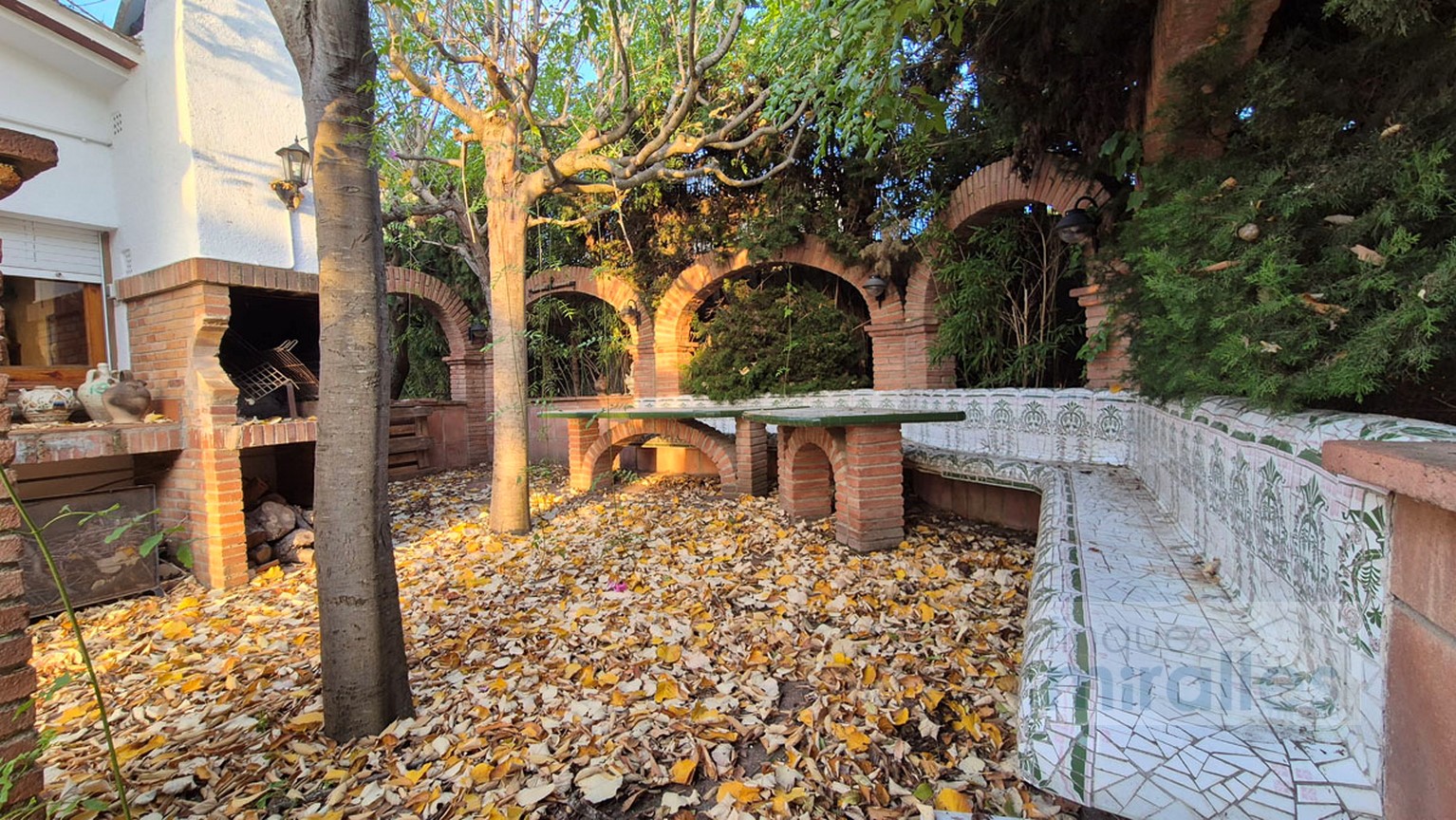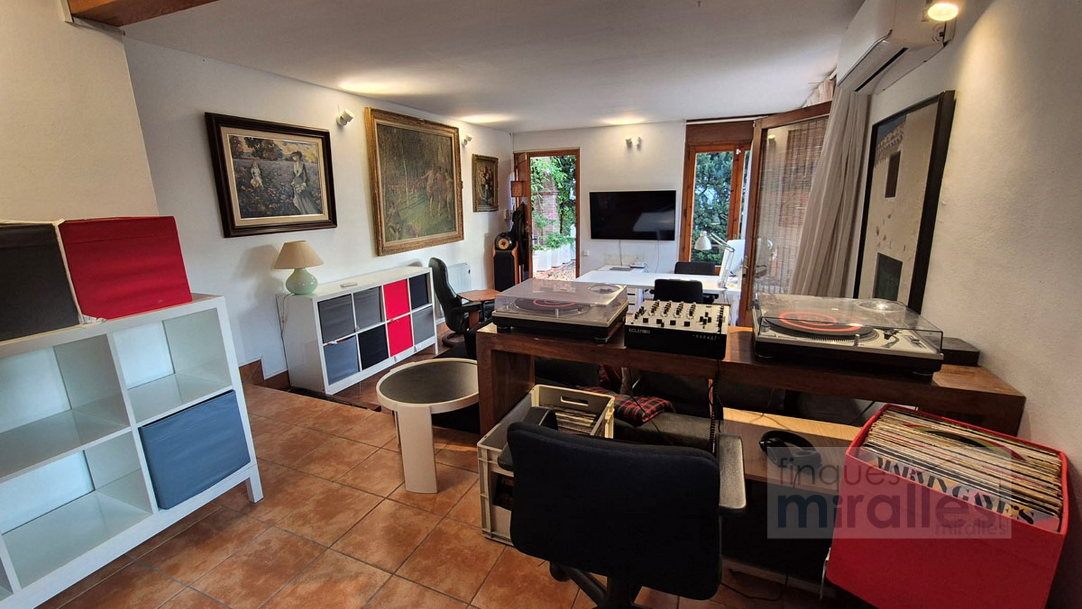 Menjador – sala d’estar amb llar de foc. (en dos nivells) Un dels nivells amb tarima de fusta, amplia cuina amb sortida al jardí.