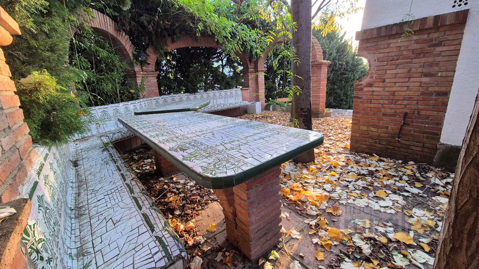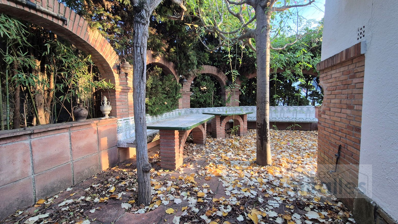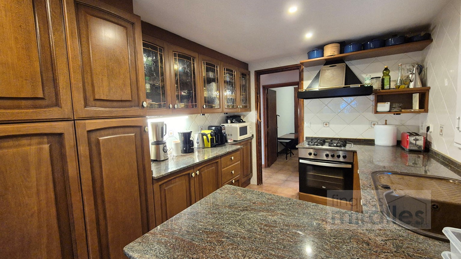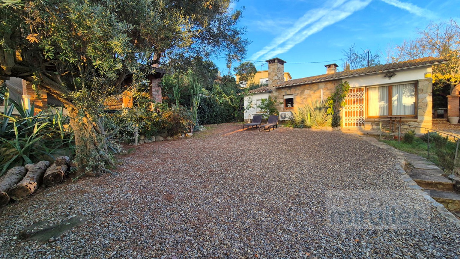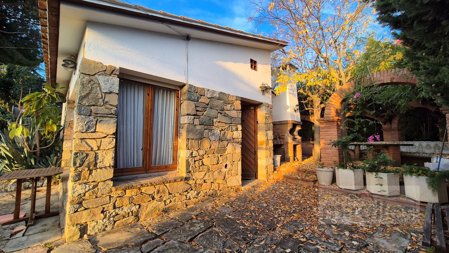 Menjador – sala d’estar amb llar de foc. (en dos nivells) Un dels nivells amb tarima de fusta, amplia cuina amb sortida al jardí.